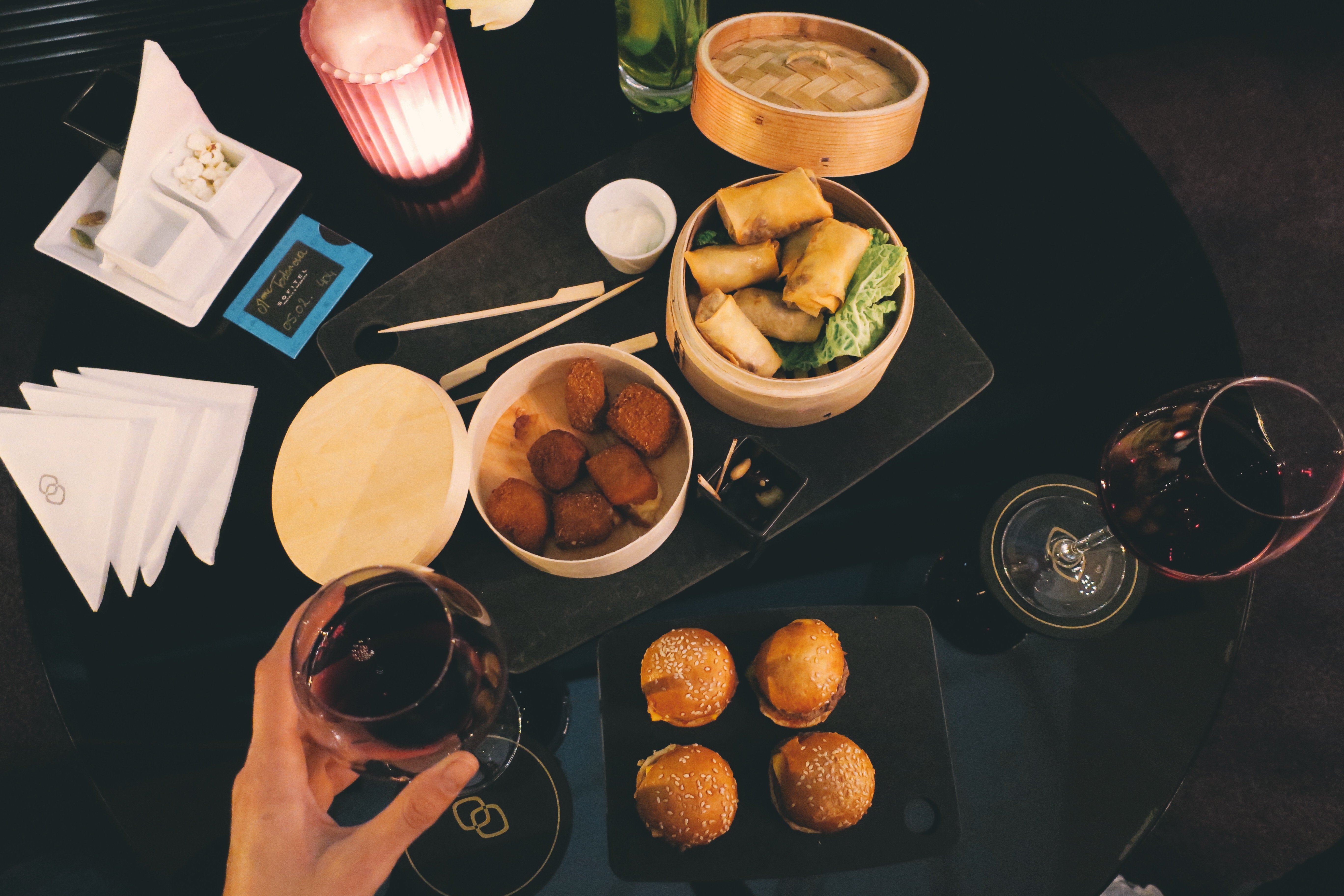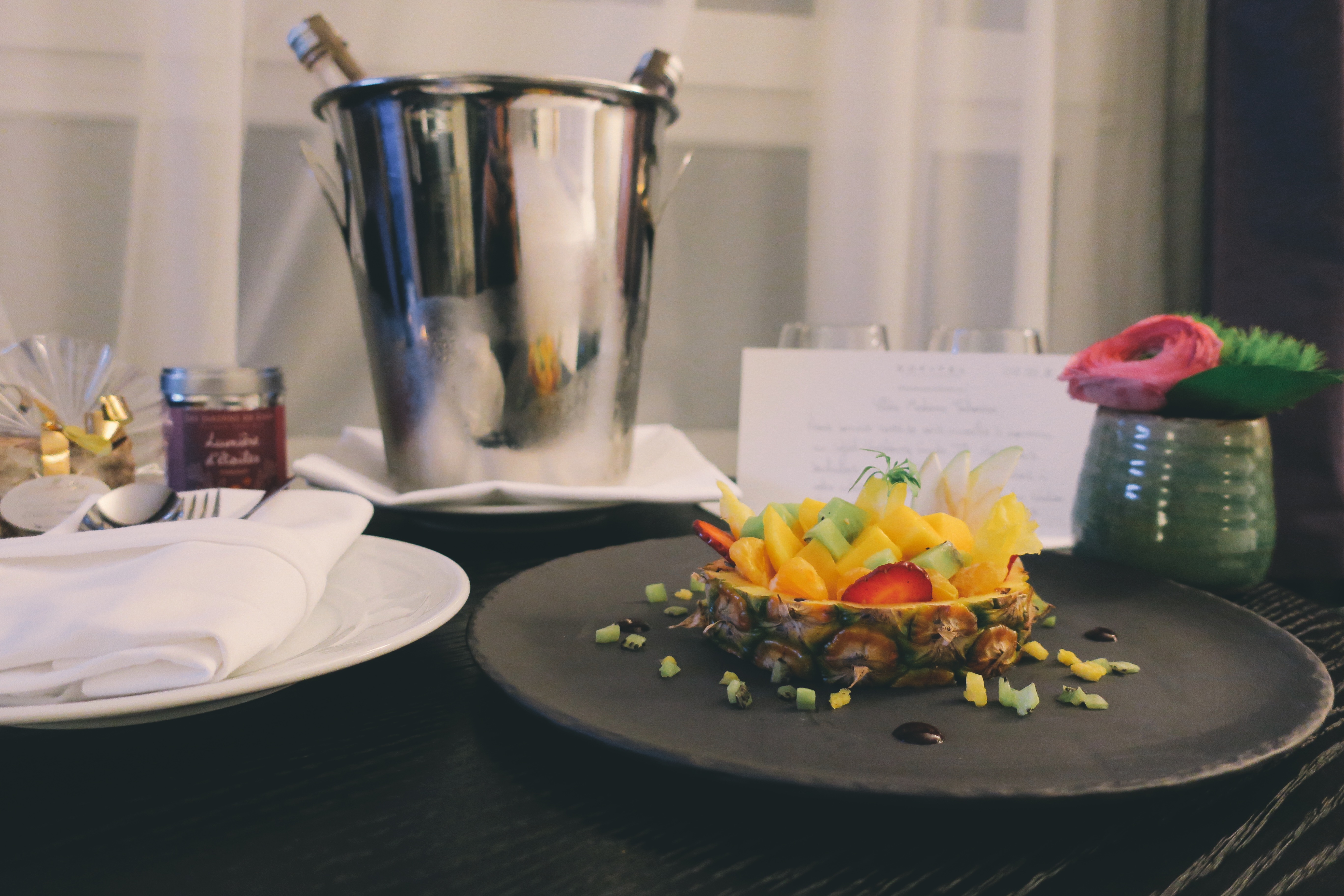 Nous avons été accueillis comme des rois avec un petit mot trop mignon dans la chambre, des jus, et un joli tartare de fruits exotiques (je dis pas salade de fruits parce que ça fait cantine ^^). Ensuite, nous sommes allés prendre l’apéritif dans le grand hall de l’hôtel et on s’est fait plaisir : mini burger, croquettes de fromage, nems, et du bon vin rouge ! Pour info, l’assortiment de 6 tapas est à 27€, ce qui reste assez honnête vu les quantités 🙂